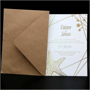 Kendine özgü zarfı da tasarlanabilen deniz temalı davetiyelerin katlamalı, kare ve dikdörtgen olarak kullanmak mümkün olabilmektedir.
