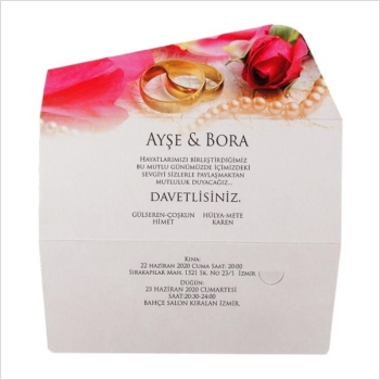 Çoğu yüzüklü davetiye modelinin zarfı sade olmaktadır. Bazı modellerde ve siz müşterilerimiz tarafından istenirse eğer özel kesim ve renkten oluşan zarflar da tasarlanabilmektedir.