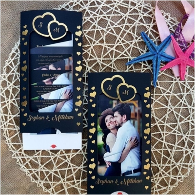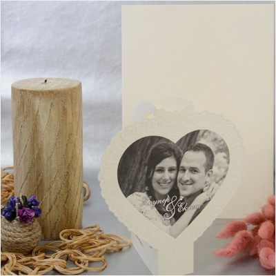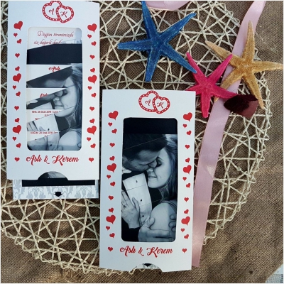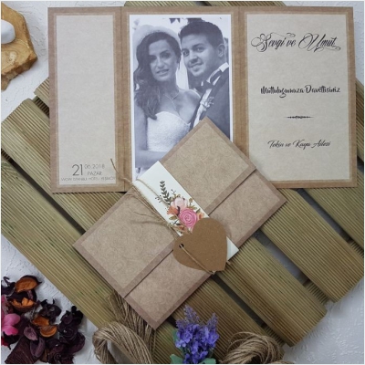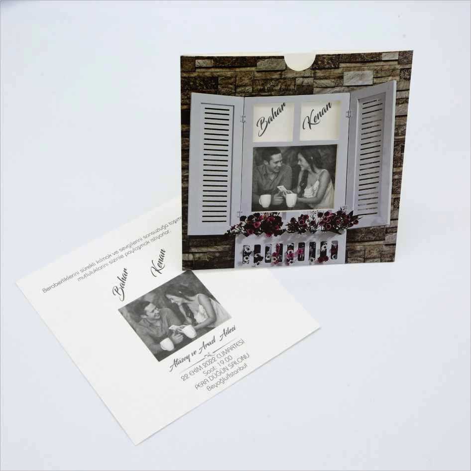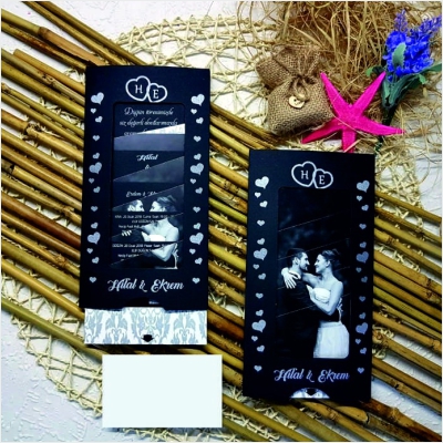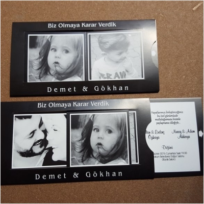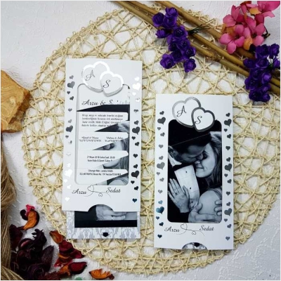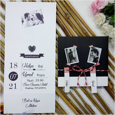 Oval, Kare, Dikdörtgen, Katlanabilir ve hareketli olarak tasarlanabilen fotoğraflı davetiyeler üzerine evlenecek çiftlerin günlük hayattan veya özel bir gününden çekildiği resim konularak daha akılda kalıcı ve zarif hale getirilmektedir.