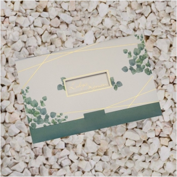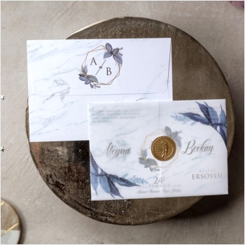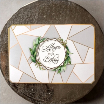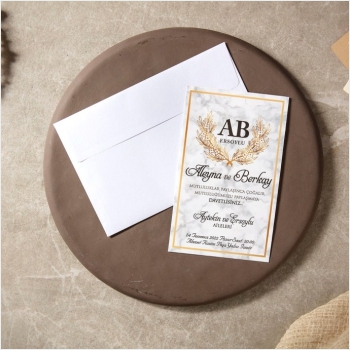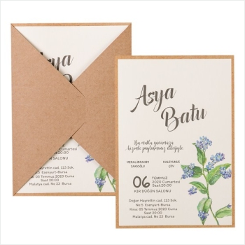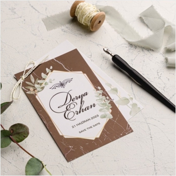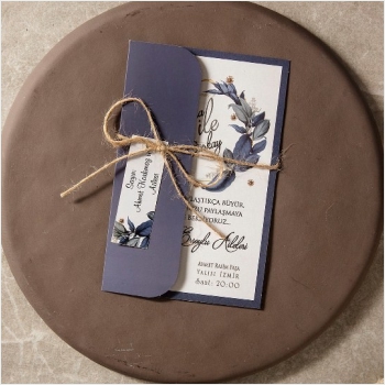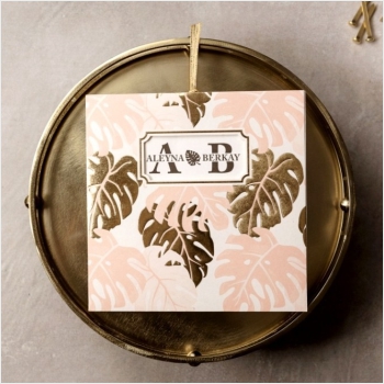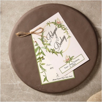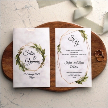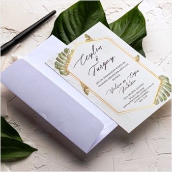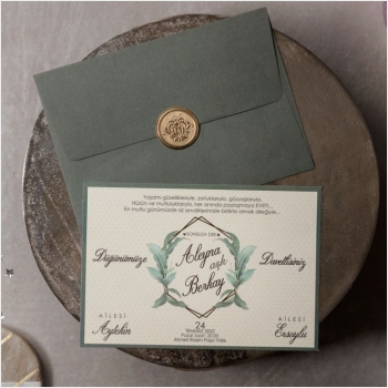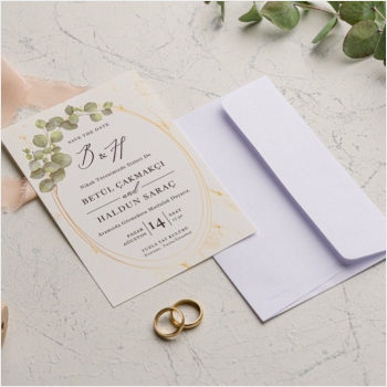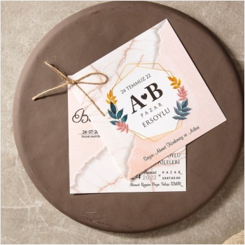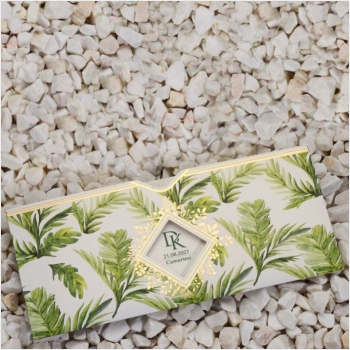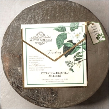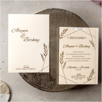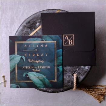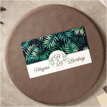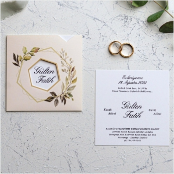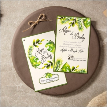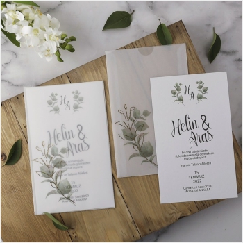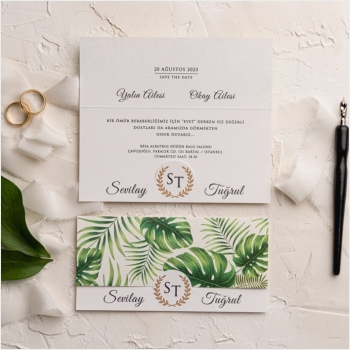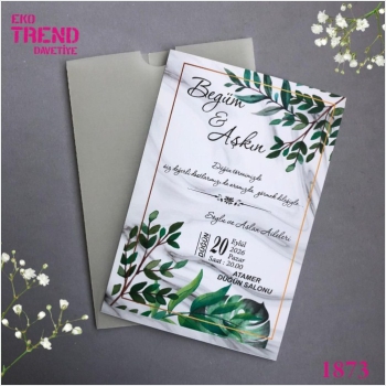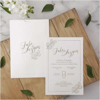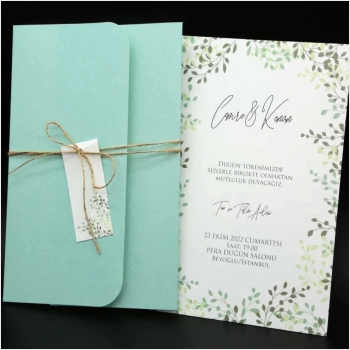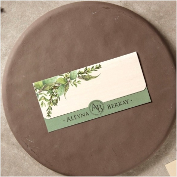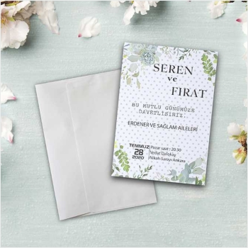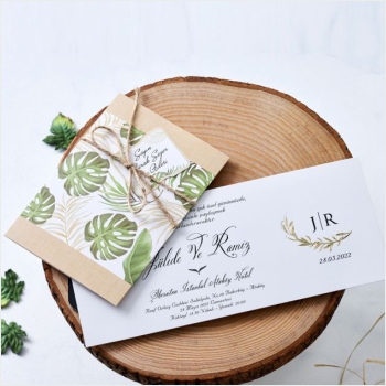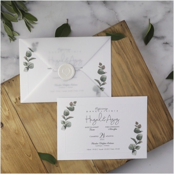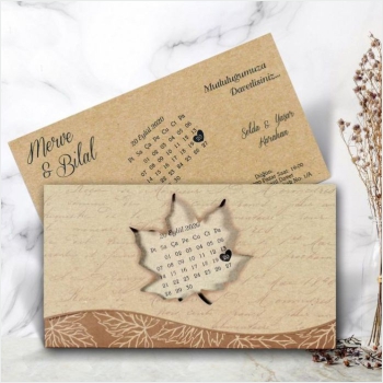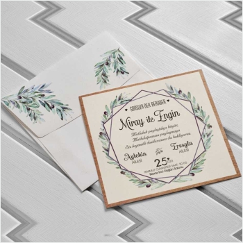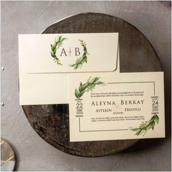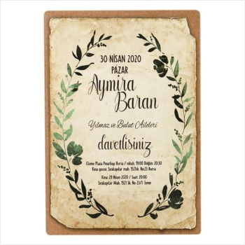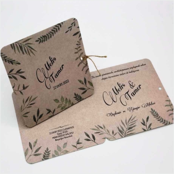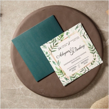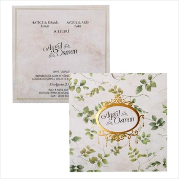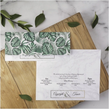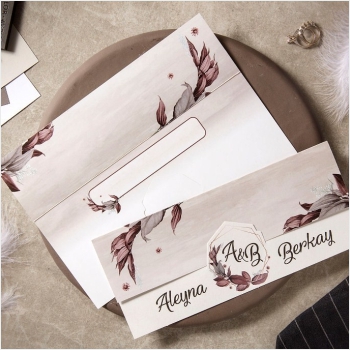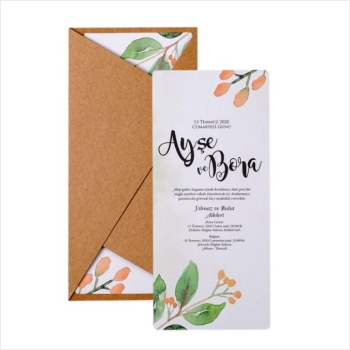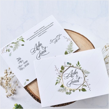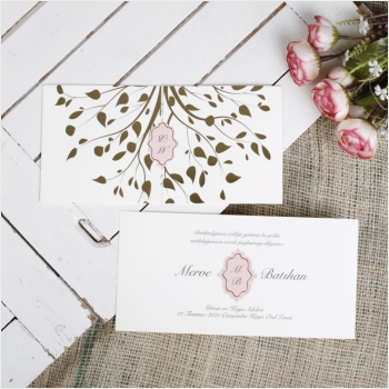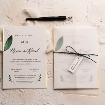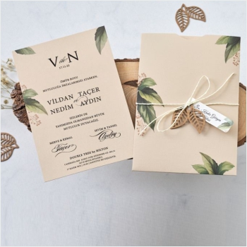 Davetiye üzerinde bulunan yaprak görselleri davetiyeye doğal bir esinti ve görsel zarafet katmaktadır.